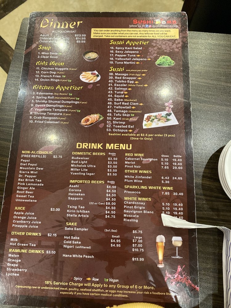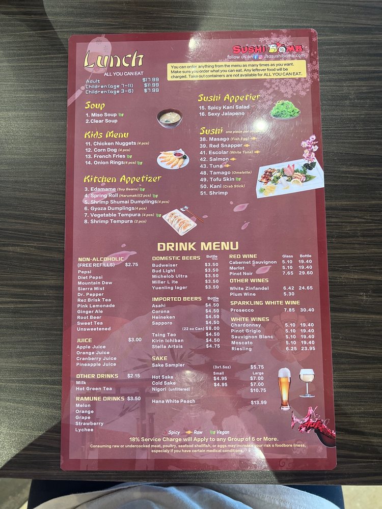 Introducing Sushi Bomb, your go-to destination for an authentic Japanese dining experience in Pittsburgh. Nestled at 6302 Robinson Ctr Dr, this vibrant eatery offers a diverse menu that caters to all appetites, featuring an extensive all-you-can-eat option priced at just $23.99. Customers rave about the fresh sushi, including crowd favorites like the Miami roll, showcasing lightly fried banana and avocado.